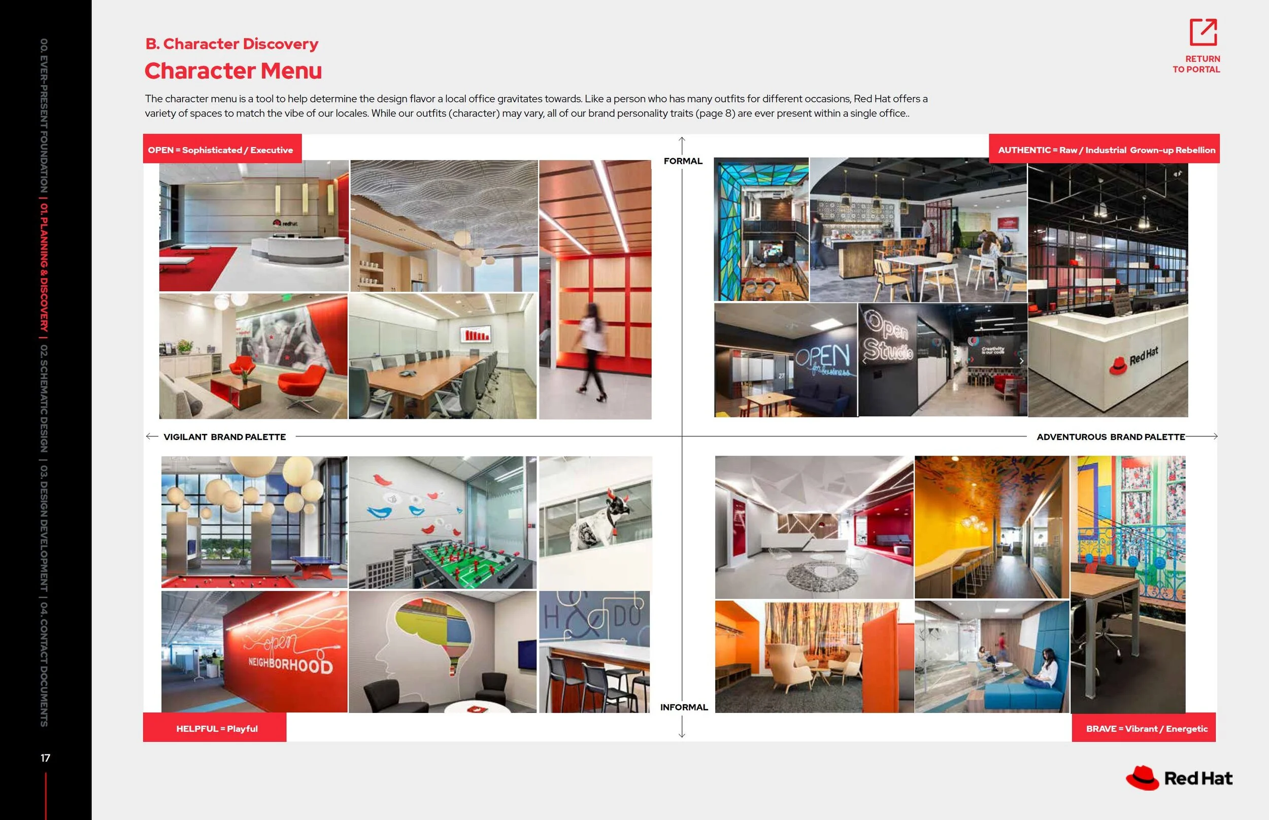Red Hat’s brand focuses on their innate nature: Open. Authentic. Helpful. Brave. They worked meticulously to update their virtual, social and print presence, and they looked to Perkins&Will to help with their evolving workplace experiences. With 95+ offices in 35 countries, it was imperative to Red Hat to bring their brand to life and celebrate what makes each office culture unique.